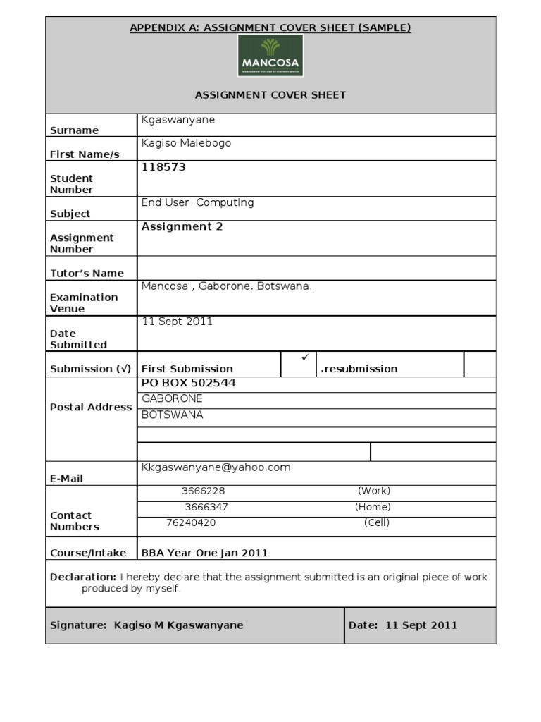 Assignment MANCOSA Assignment Cover Page Scribd May 2nd 2018 - Assignment Cover Page Free Download As Word Doc Doc PDF File Pdf Text File Txt Or Read Online For Free This Is A Sample Assignment Cover Page mancosa assignments ads gumtree classifieds south africa may 2nd 2018 - find mancosa assignments postings in south africa search gumtree. Search the worlds information including webpages images videos and more. There is no need to number the cover page when youre using the Chicago style.